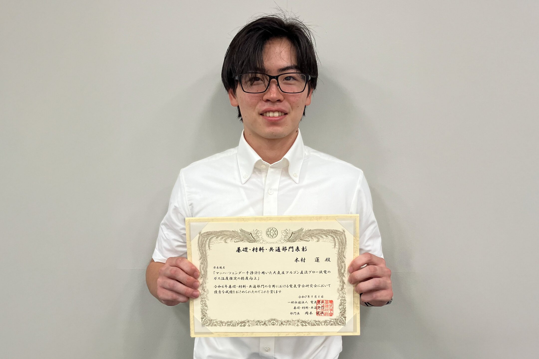 プラズマ分野の発展に資する若手技術者の優秀な論文として、電気学会 基礎・材料共通部門にて評価され表彰されました。