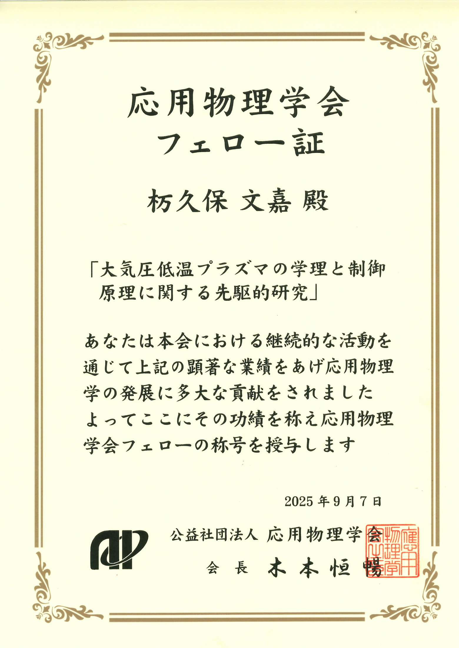 応用物理学会 「フェロー表彰」を受賞しました!