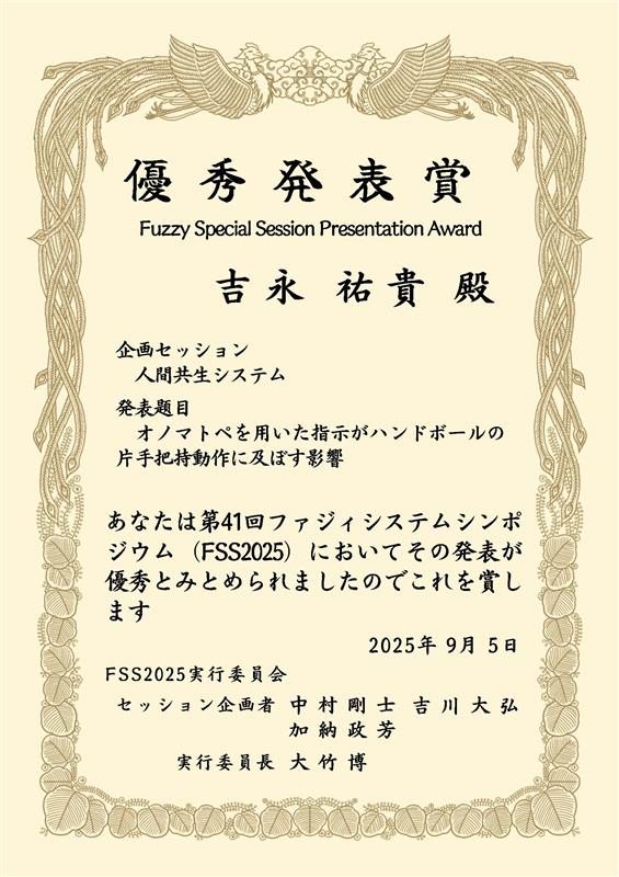 第41回ファジィシステムシンポジウム(FSS2025)、企画セッション「人間共生システム」において発表が優秀とみとめられ受賞しました。