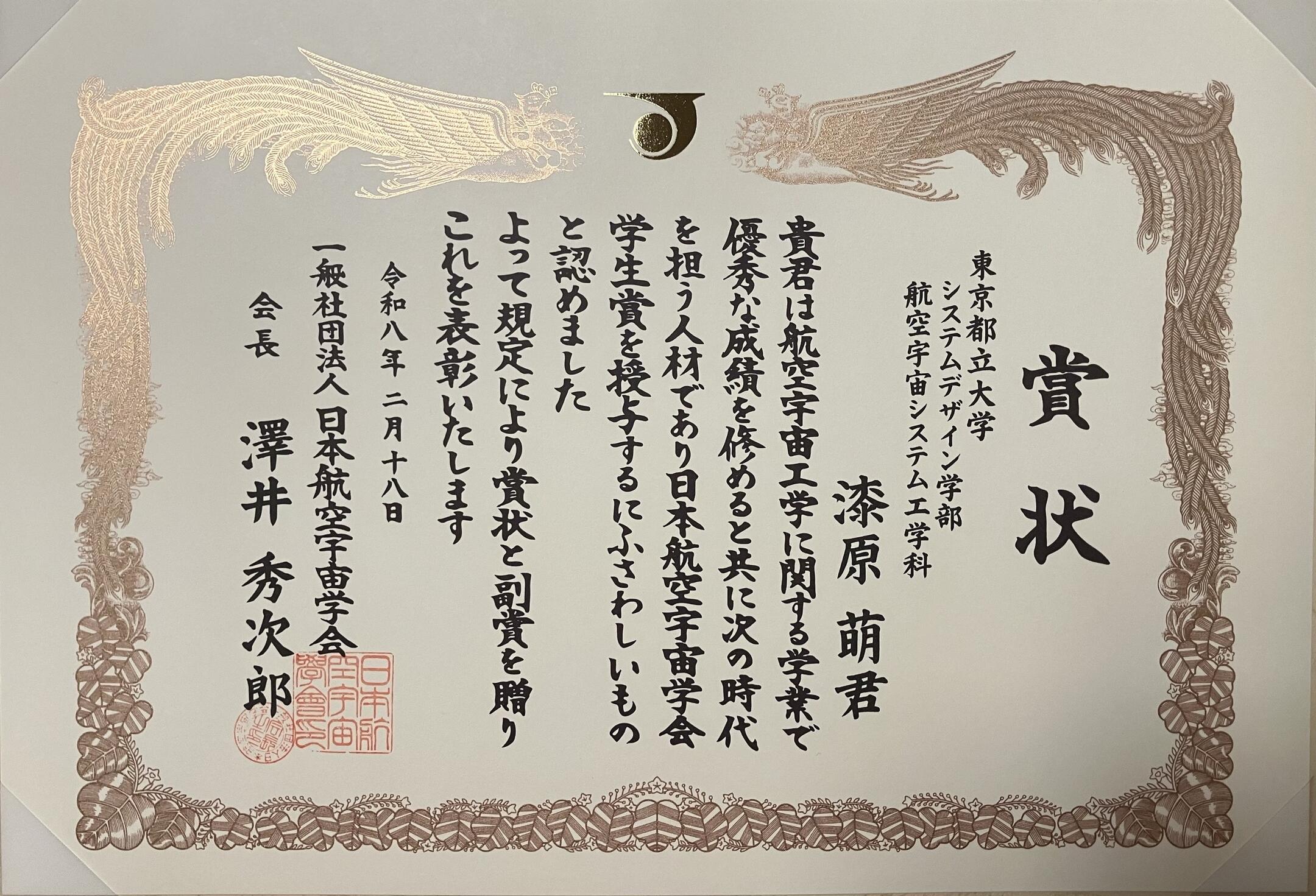 日本航空宇宙学会「学生賞」を受賞しました!